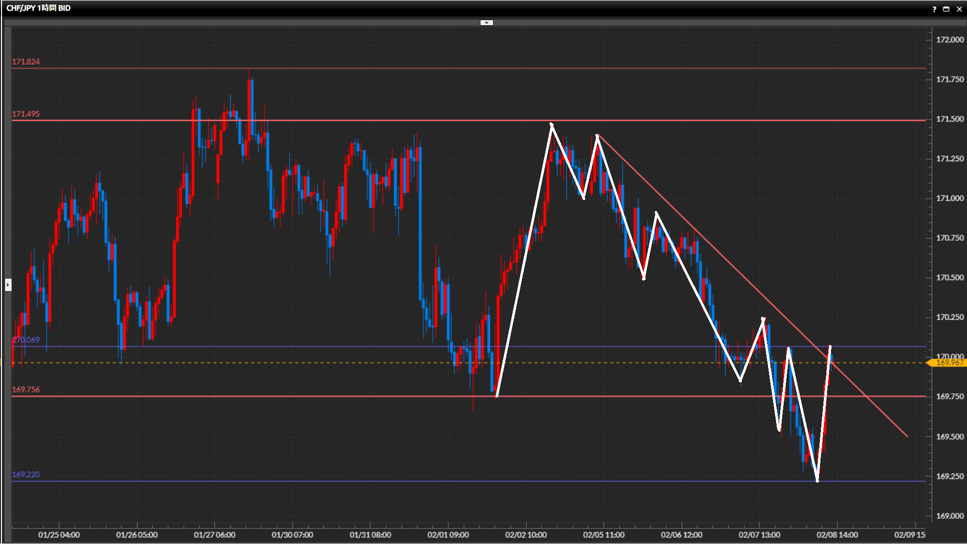 169.22円まで安値をつけてから強い上昇が入り、直近高値170.07円も一気に切り上げてしまったため下目線終了。
