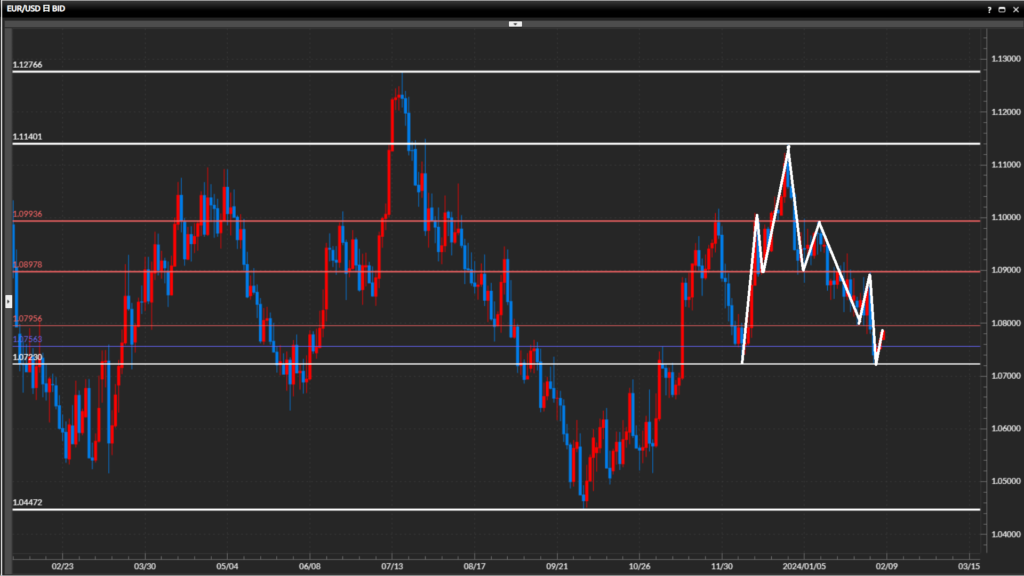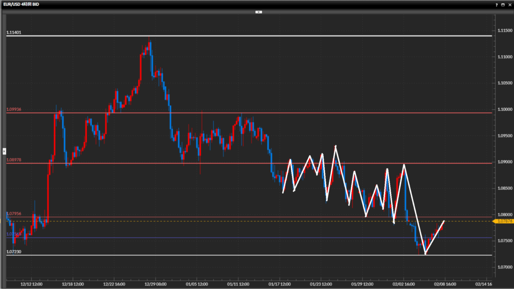 • ユーロドル日足は下目線、4時間足はレンジ終了、1時間足は上目線