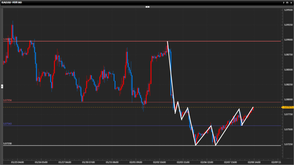 日足水平線1.0723ドルでダブルボトムを形成してじわじわ上昇中。