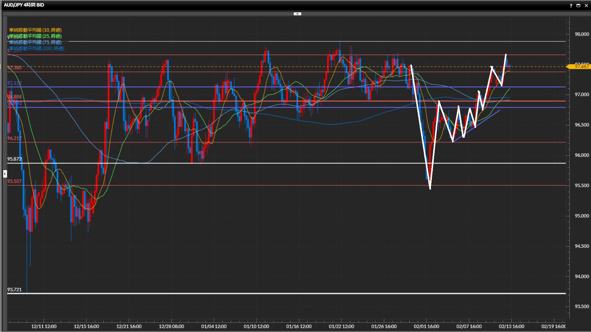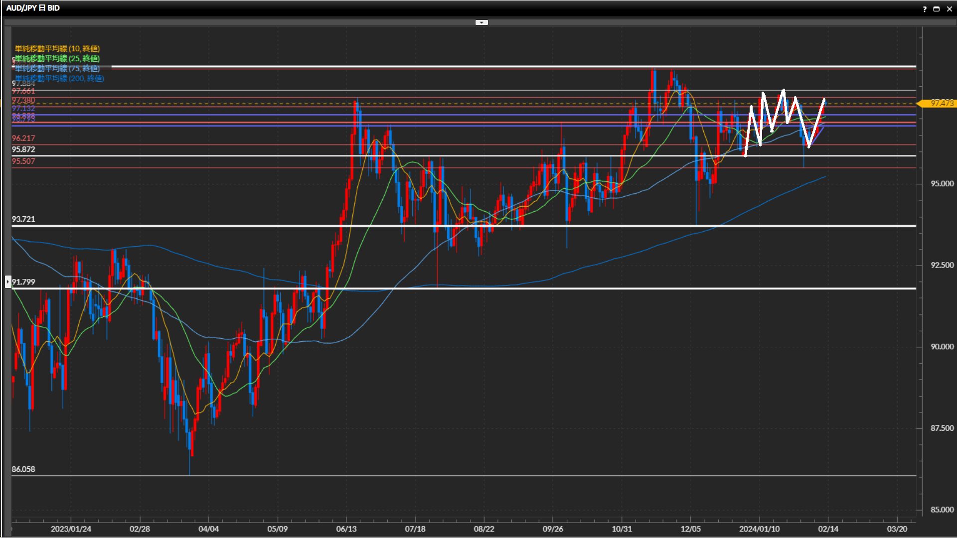 基本は押し目買い。1時間足が上目線固定になったら仕掛け。 - 豪ドル円は日足〜4時間足は上目線、1時間足は下目線終了。