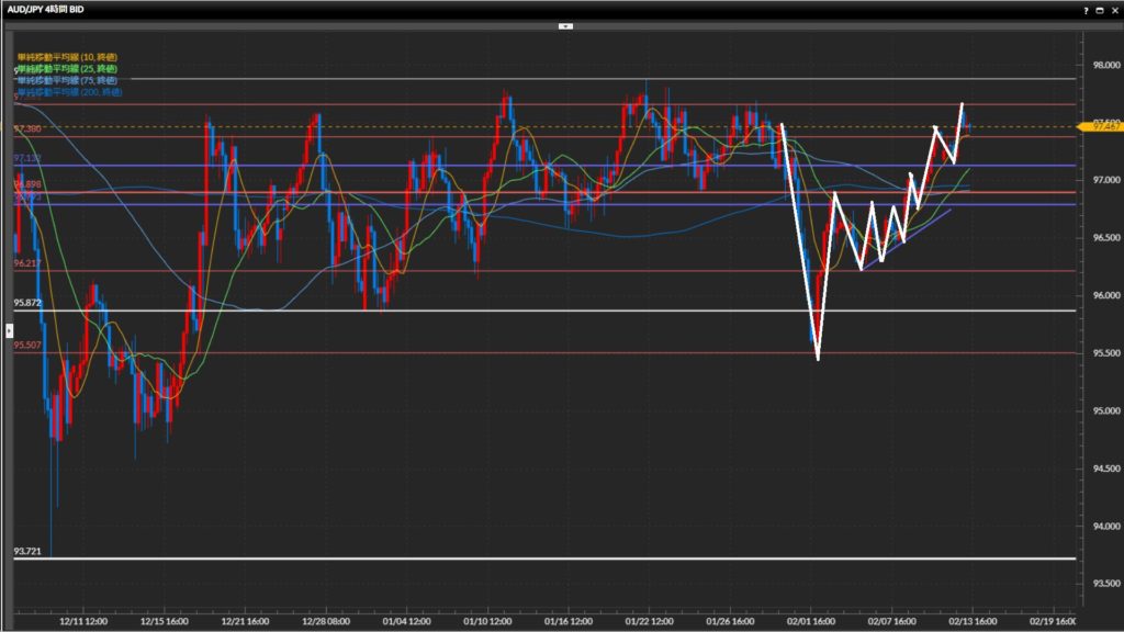下目線に切り替わったものの下落が続かず、下落の起点である97.66円まで上昇中。