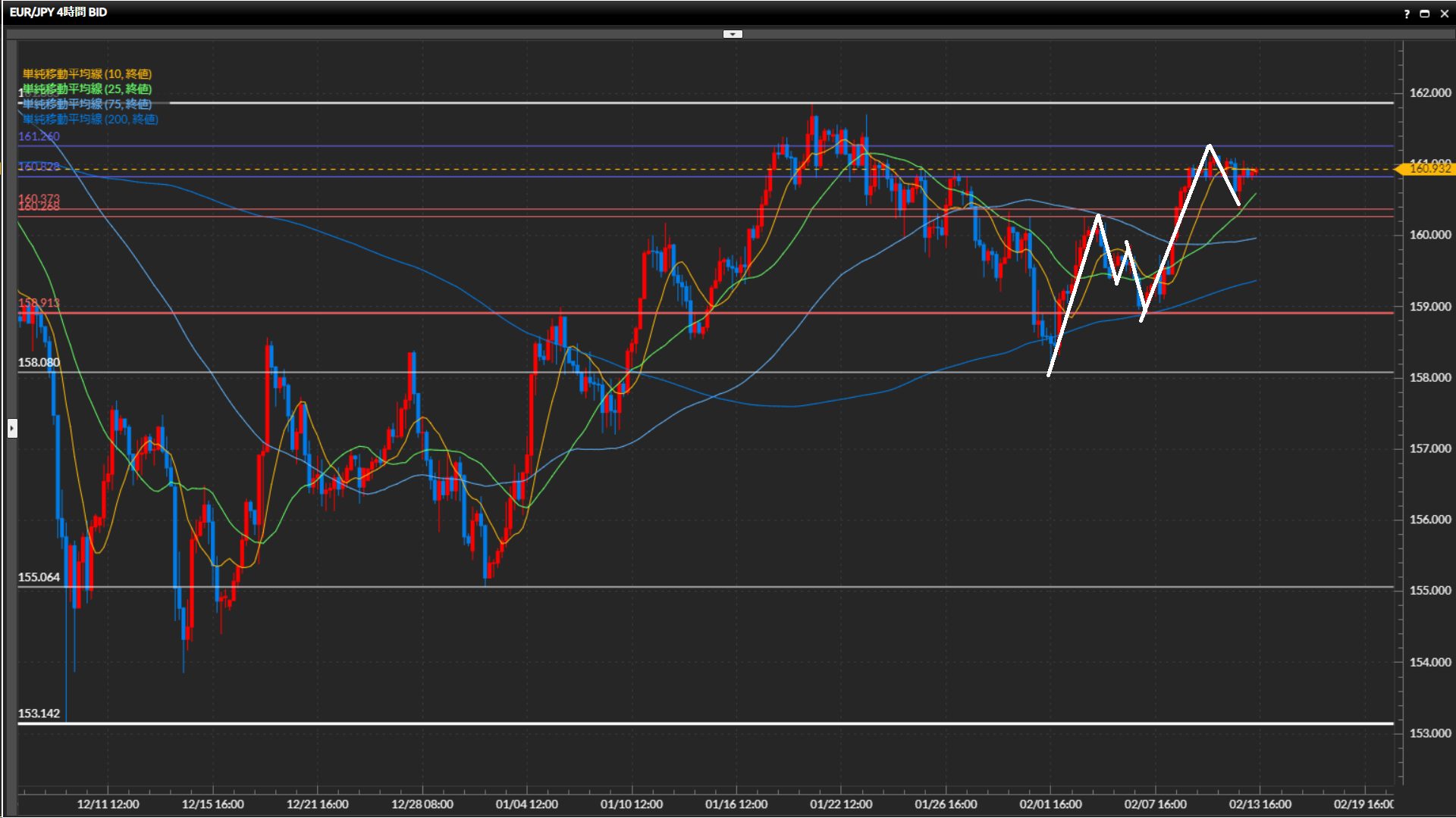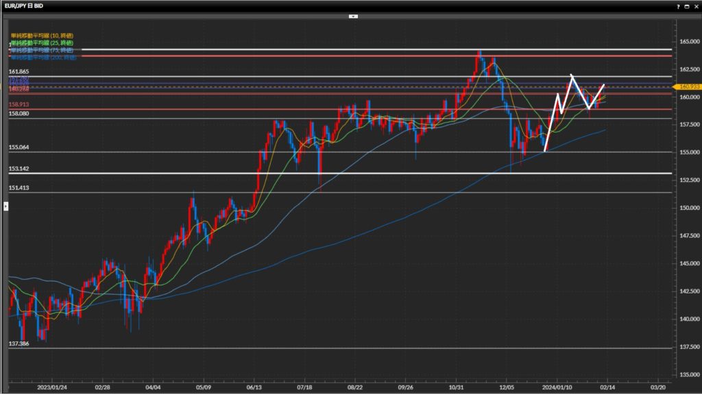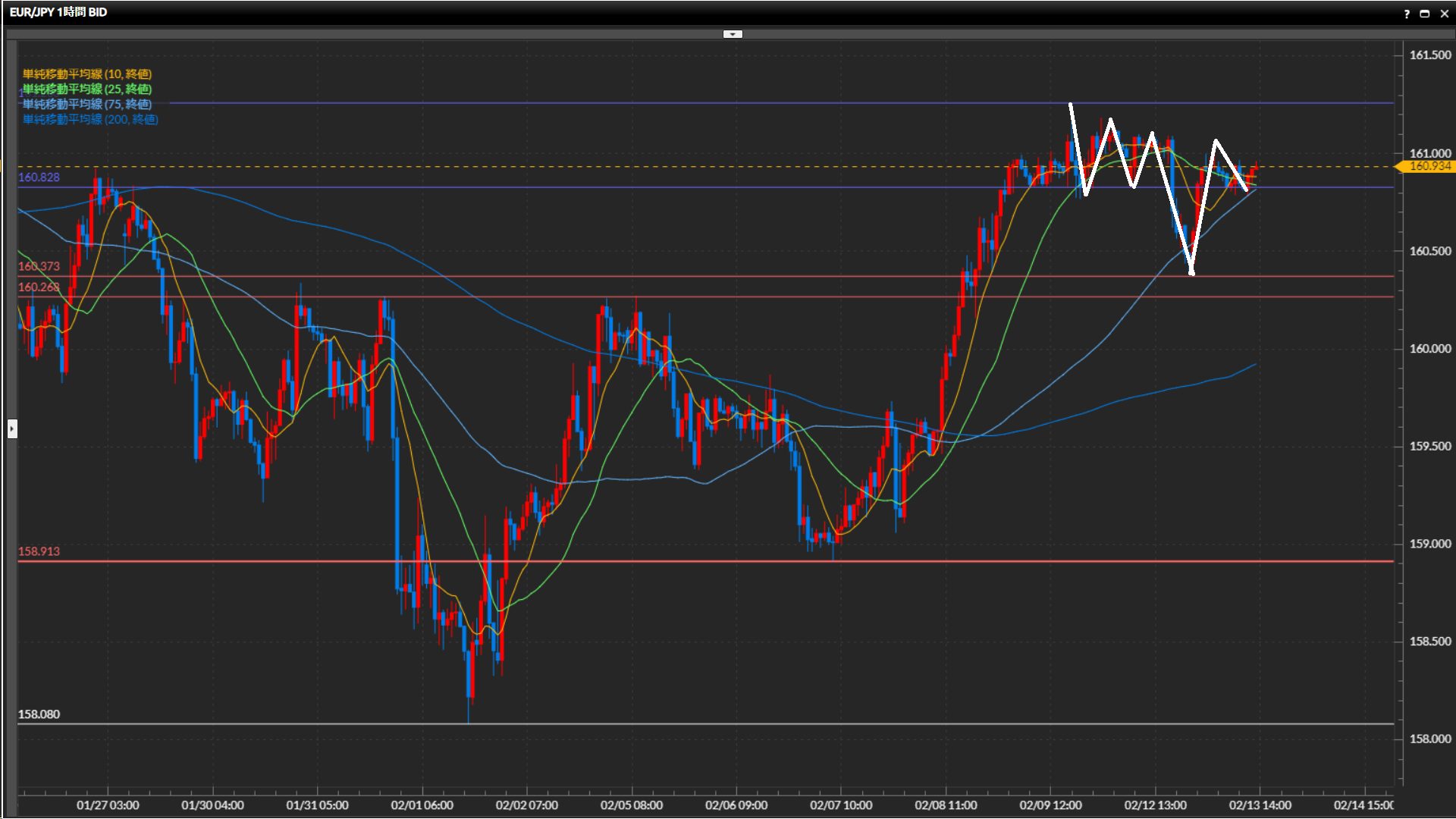 基本は押し目買い。150円台突入が意識される。 - ユーロ円は日足〜4時間足は上目線、1時間足は下目線終了。