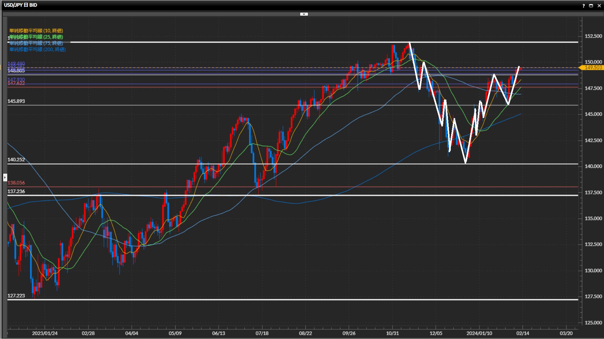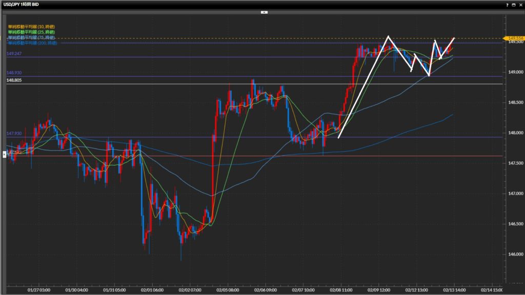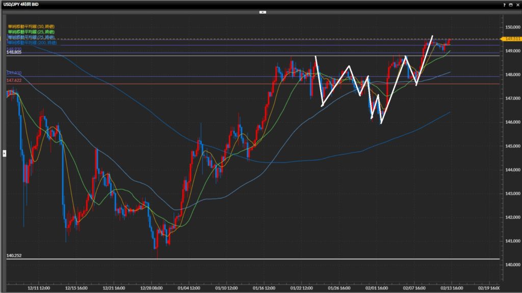 直近安値は149.25円。直近高値の149.48円を上抜け、高値を試している。