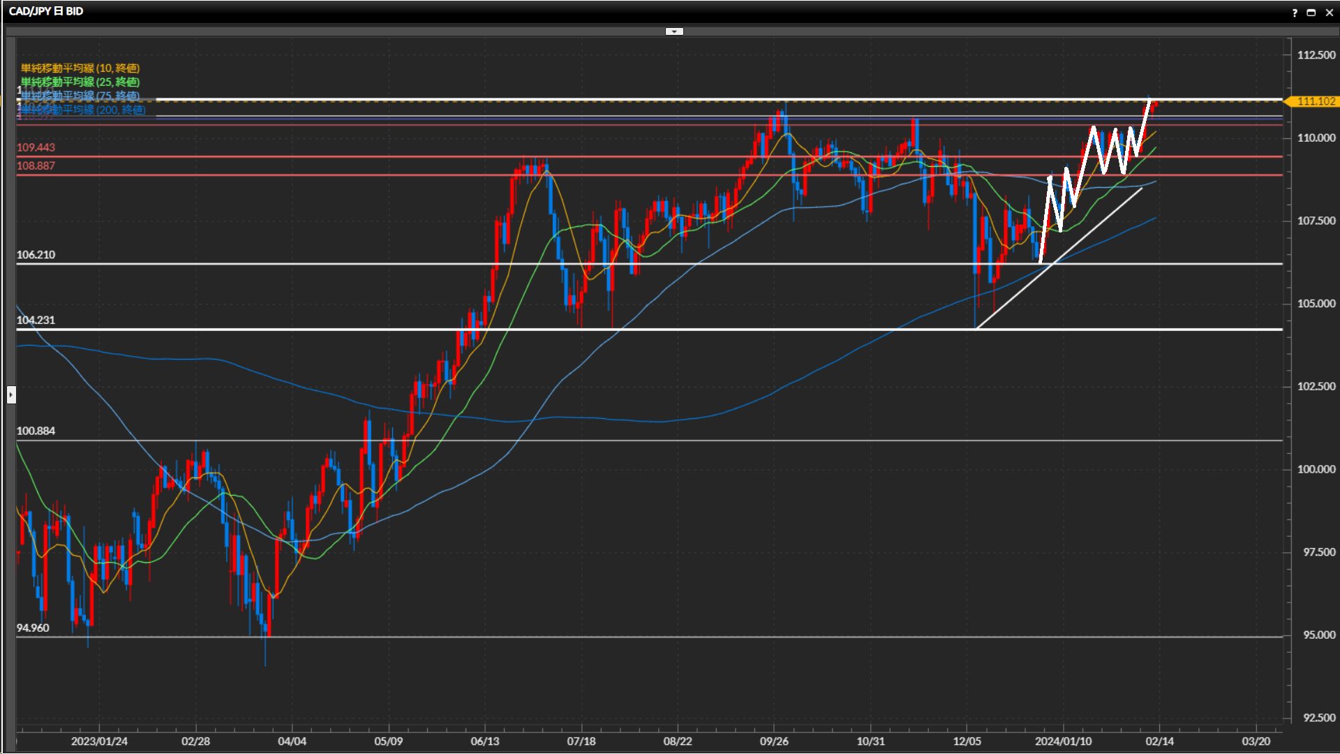 直近安値は109.44円。日足最高値111.17円の更新チャレンジ中。