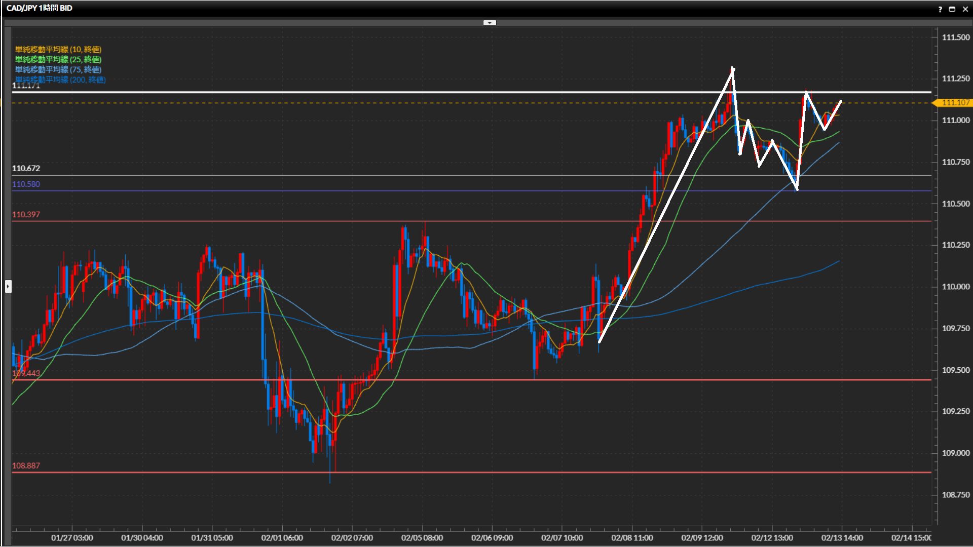 直近安値は110.67円。直近の波で日足最高値111.17円をひげ足で一度抜けている。