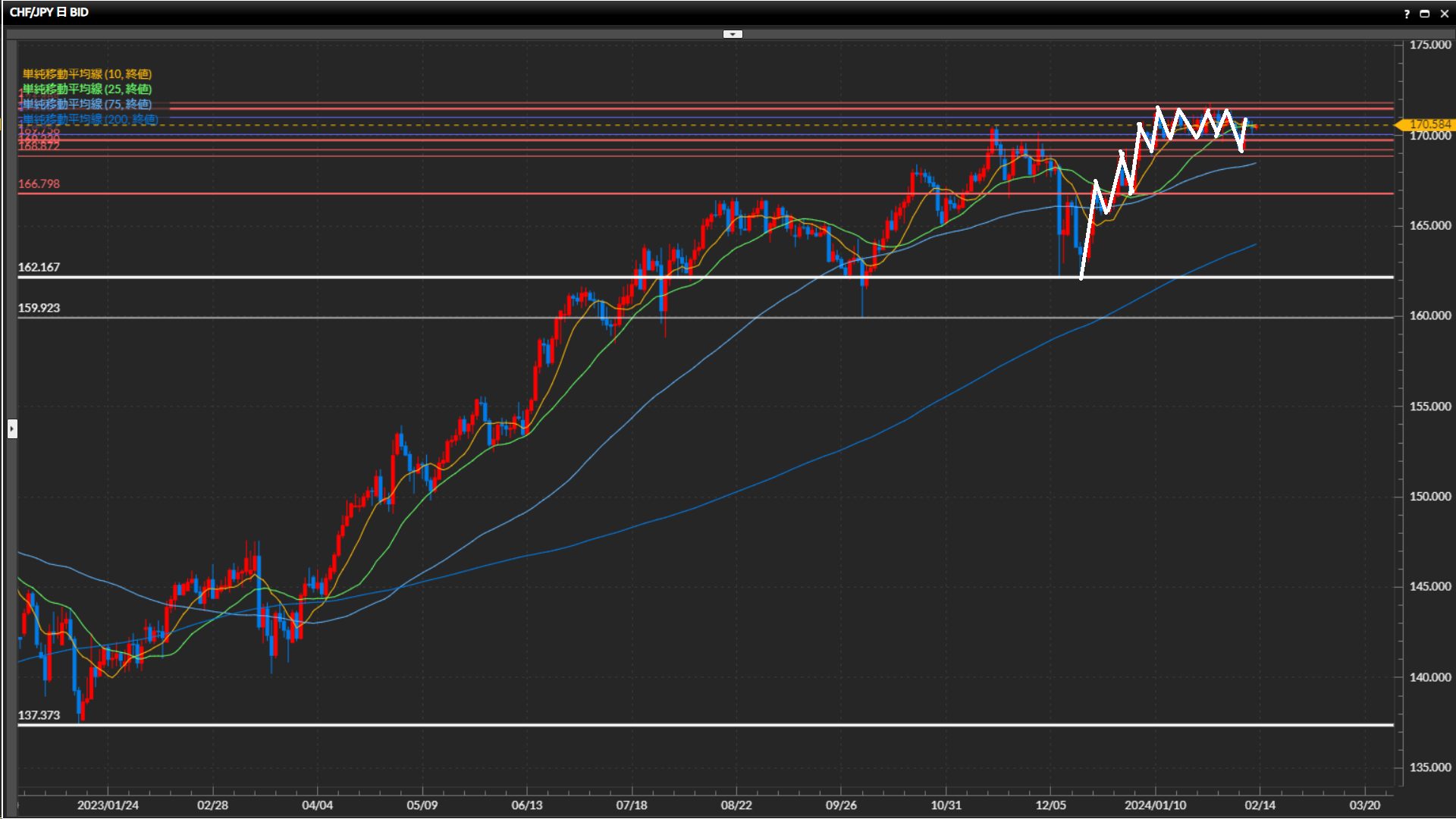 高値圏の揉み合いが継続中。上昇波に明確な押し目がないが、半値線166.80円が安値の目安。