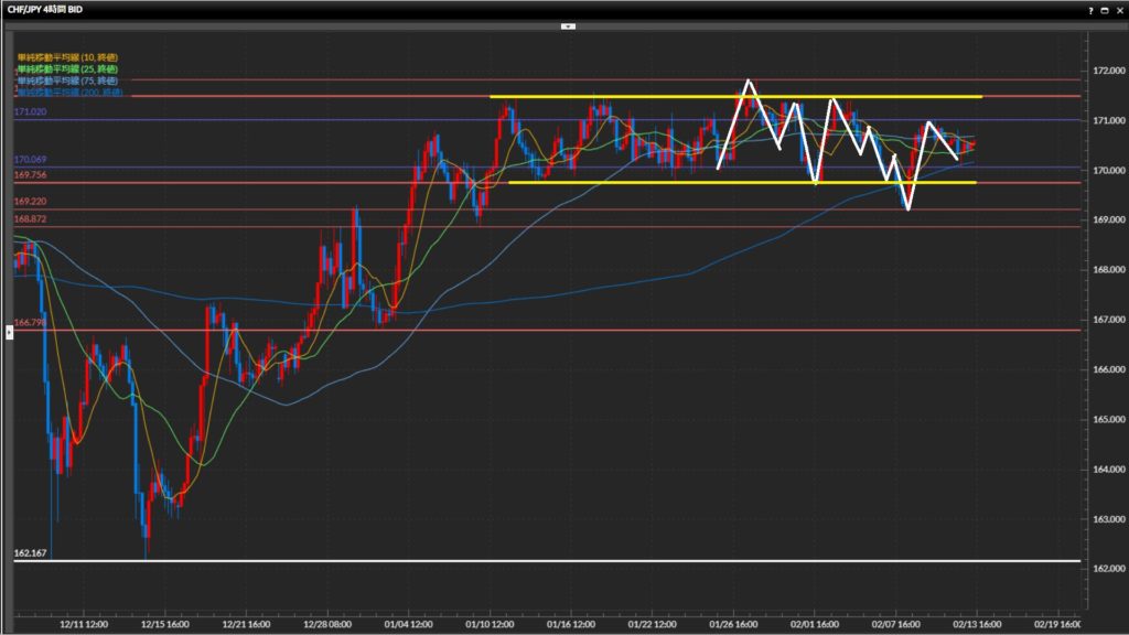 • フラン円日足〜4時間足でレンジ、1時間足は下目線終了。