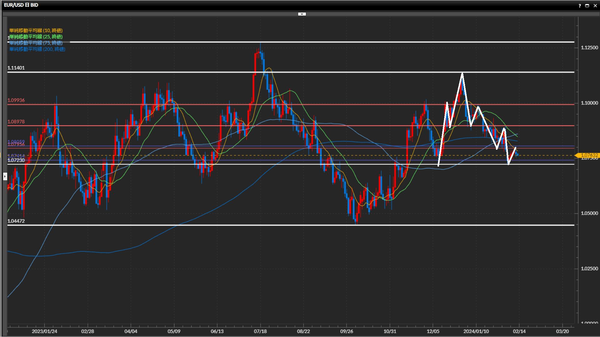 直近高値は1.0898ドル。日足水平線1.0723ドルの下抜けチャレンジ中。