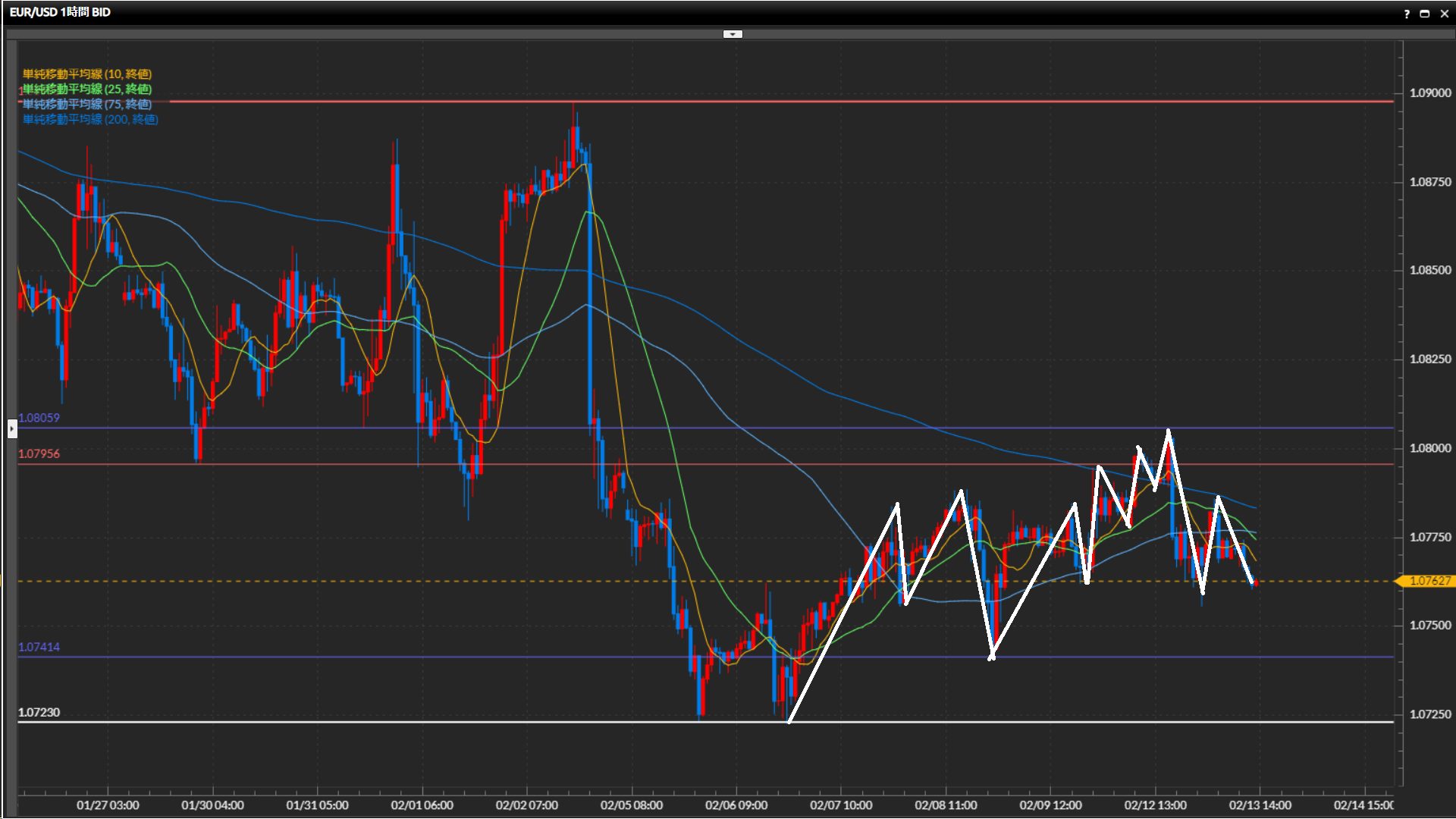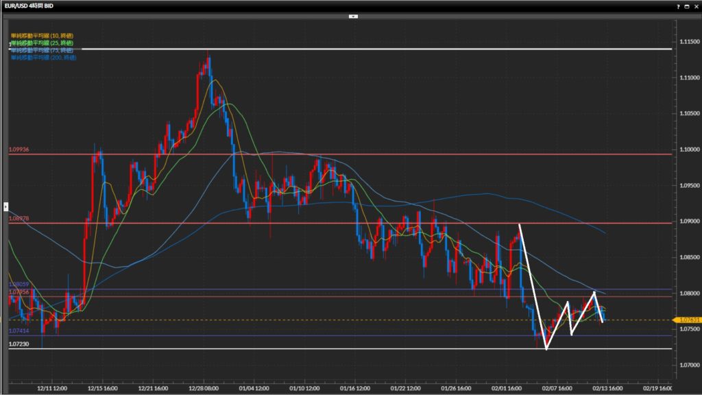 直近高値は1.0786ドル。安値1.0756ドルを切下げたら下目線固定。