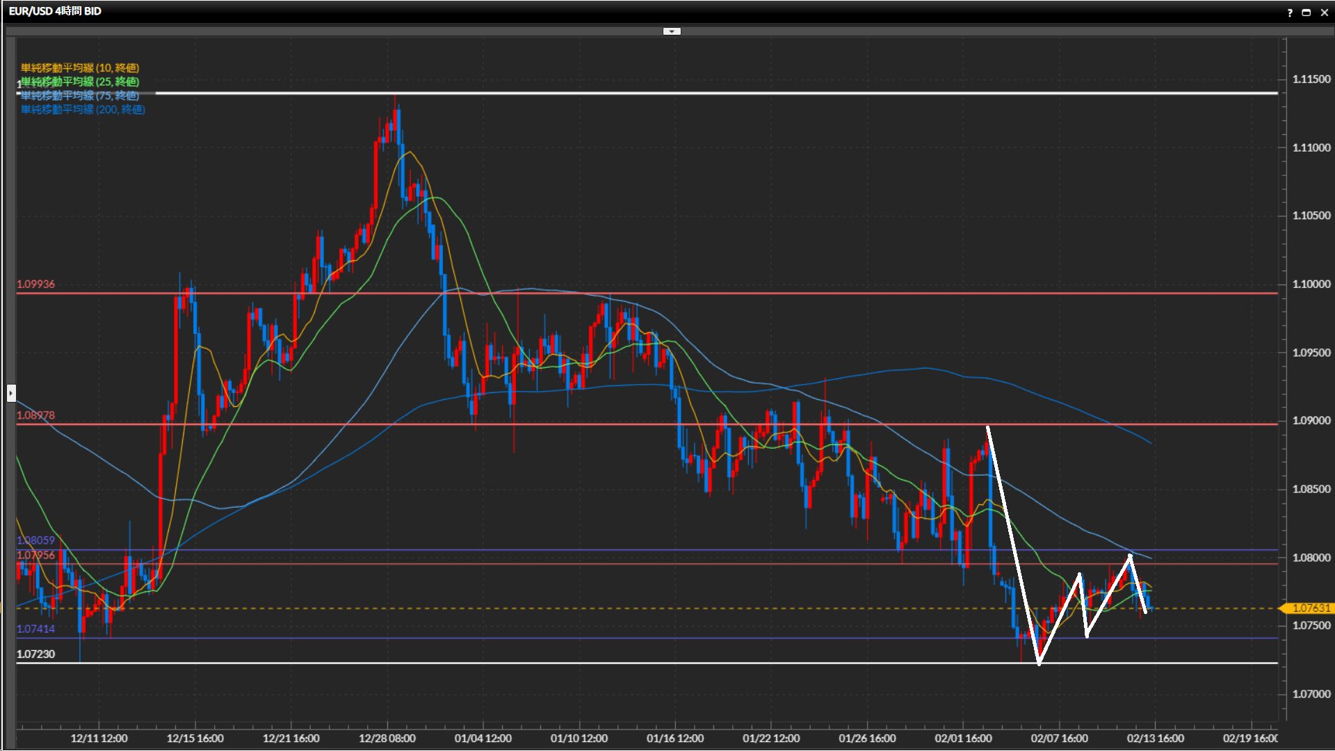 直近安値は1.0741ドル。上位足が下降トレンドな事を踏まえると、直近の高値安値切上げは修正波と捉えるのが良さそう。