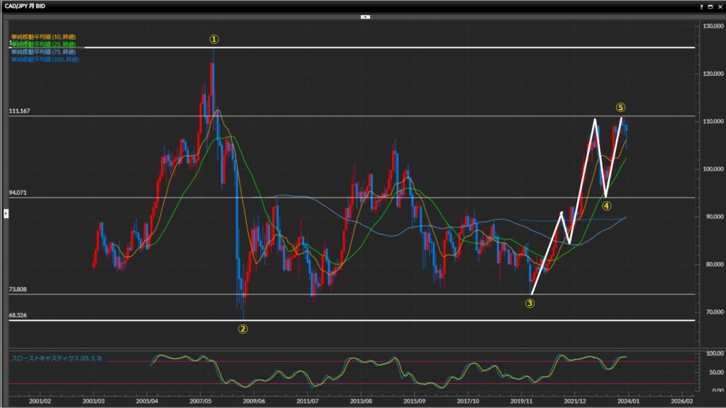 ③現在の上昇トレンドの起点は73.81円(’20/3月)。