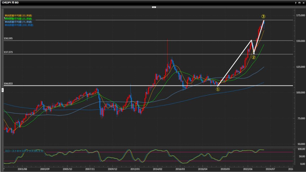 ②137.37円(’23/3月)で押し目形成。ここを切下げない限りは上目線。