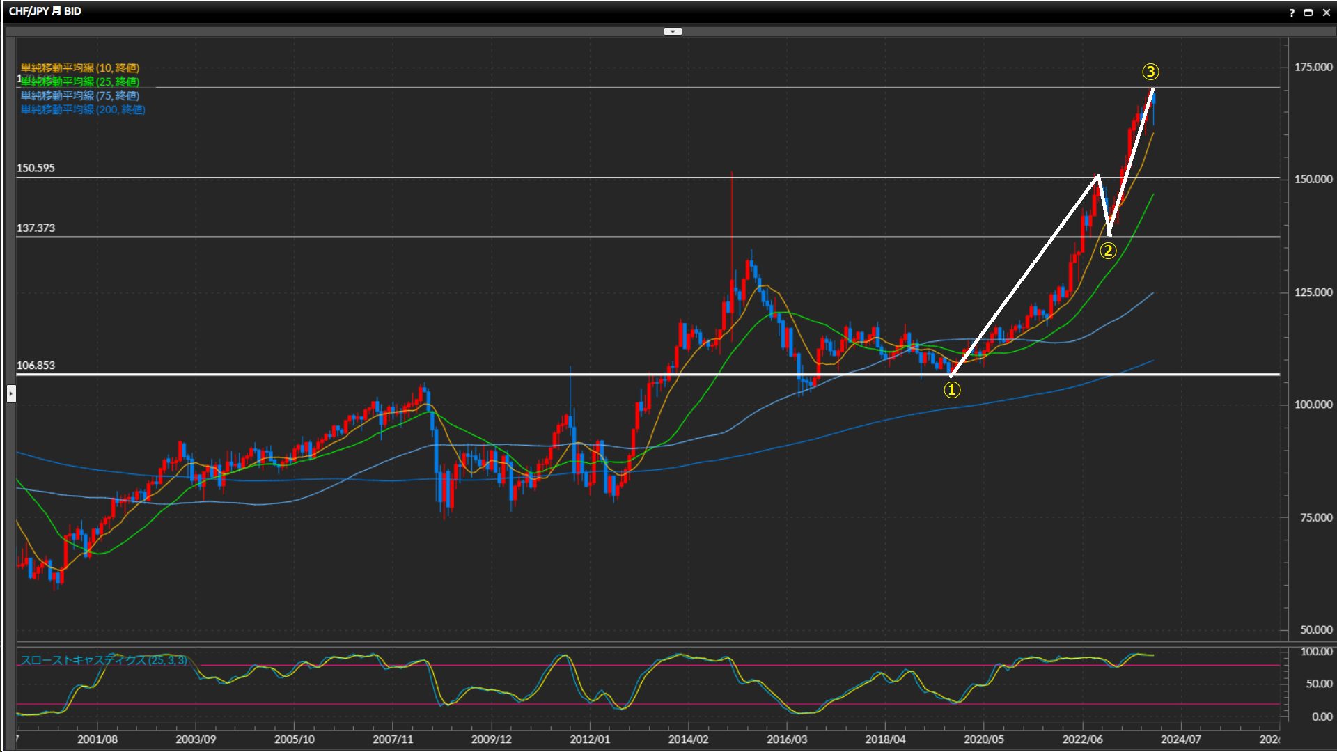 ’23年は中東情勢の緊迫化でフラン高が加速。ローソク足が10SMAに沿って上昇しており、まだまだ高値を更新しそう。