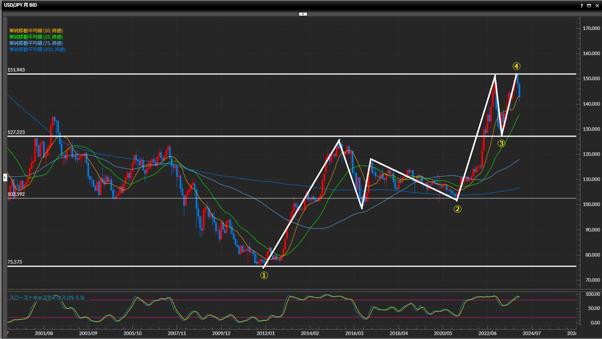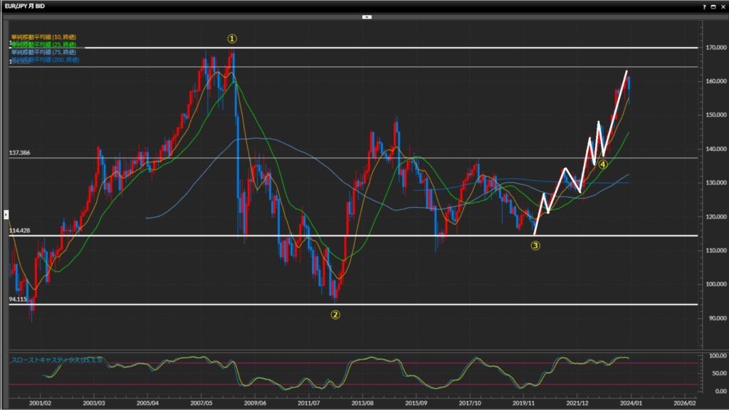 ②102.59円(’21/1月)を起点に、現在の上昇トレンドが開始。