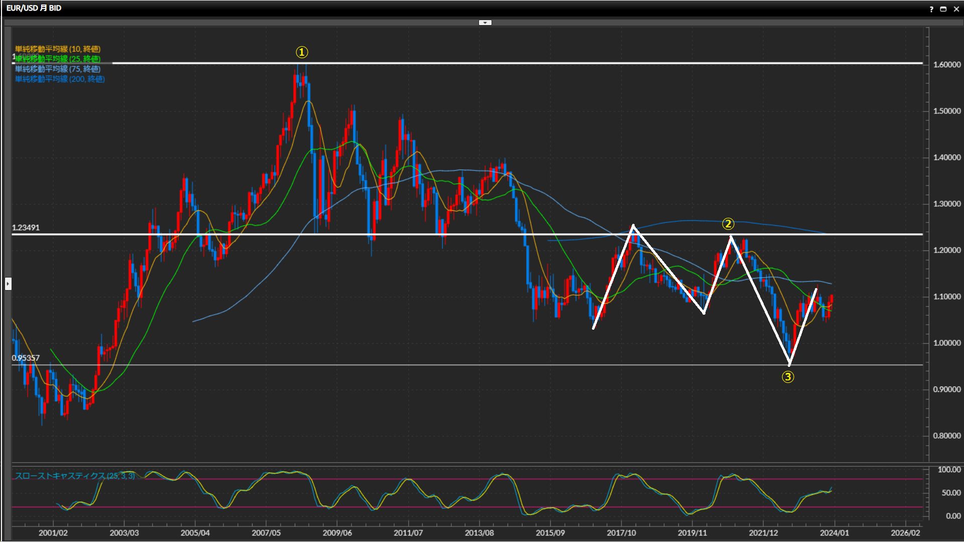 しかし月足で見ると、まだまだ上昇トレンドが継続。 - ユーロドルは下目線の中での修正局面。23年は年間通して揉み合って終了。
