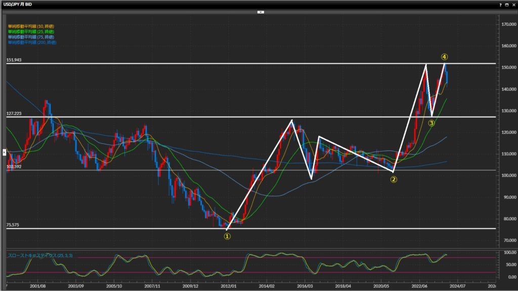④’23/11月に直近高値151.94円の更新を試したものの、一旦下落。
