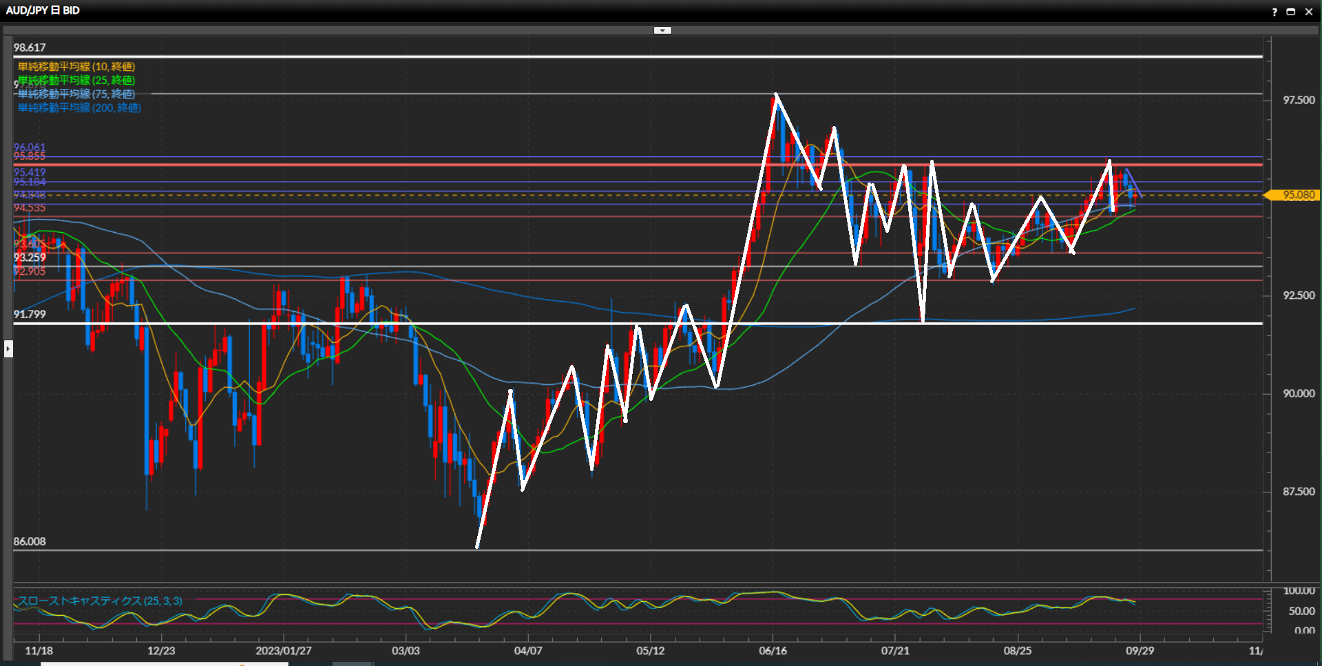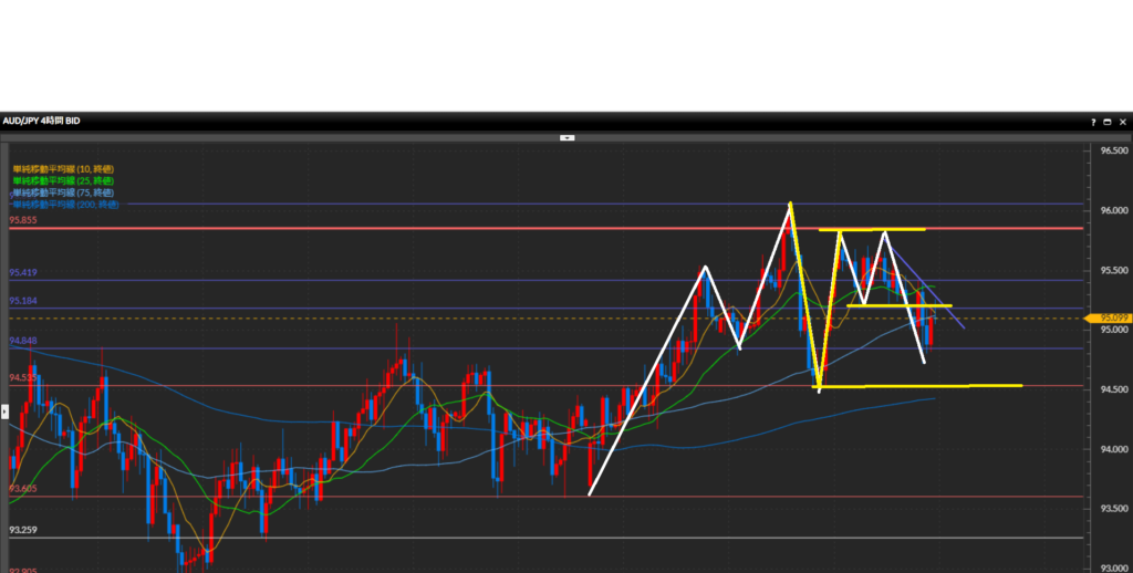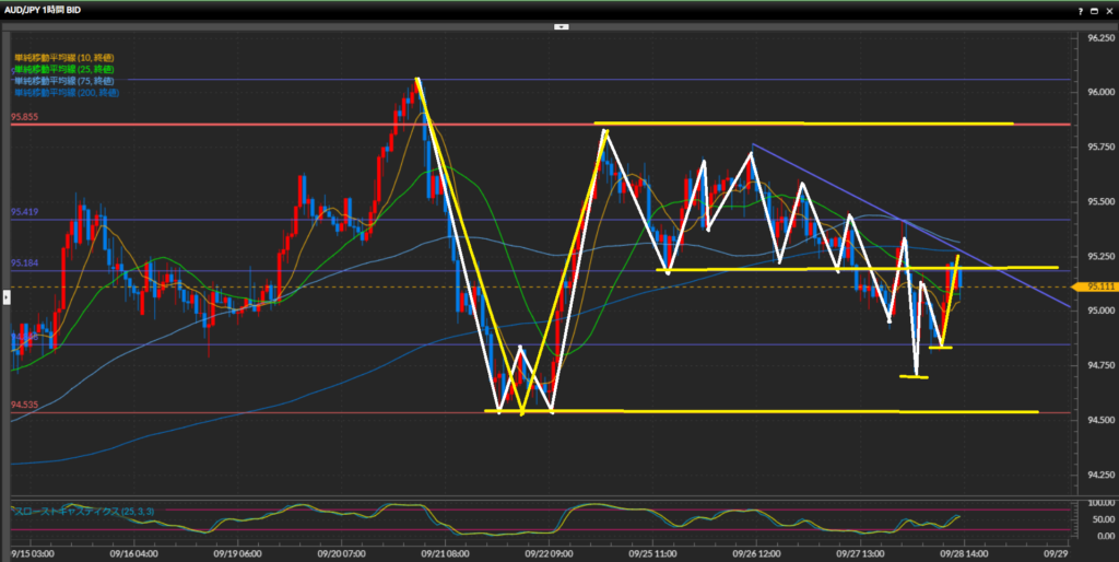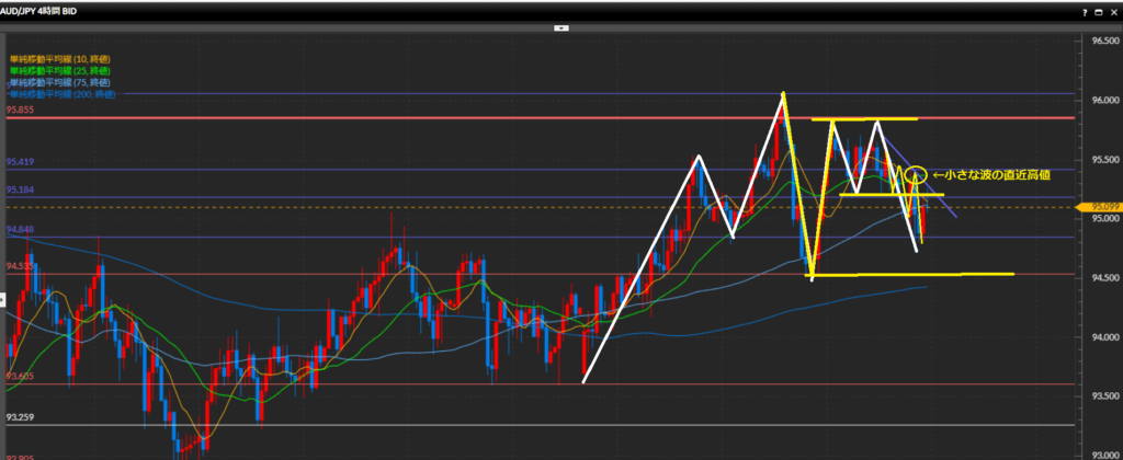 水平線95.42円で一度レジスタンスされ小さな波の高値を作り、さらに価格を押し下げています。