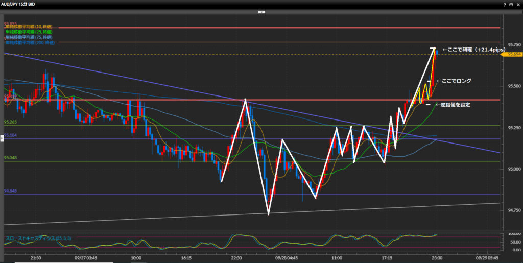 今回の場合だと、95.42円の水平線が今度はサポートとして機能し、15分足で直近波の安値を作っているので、ここを下抜けたら損切りです。